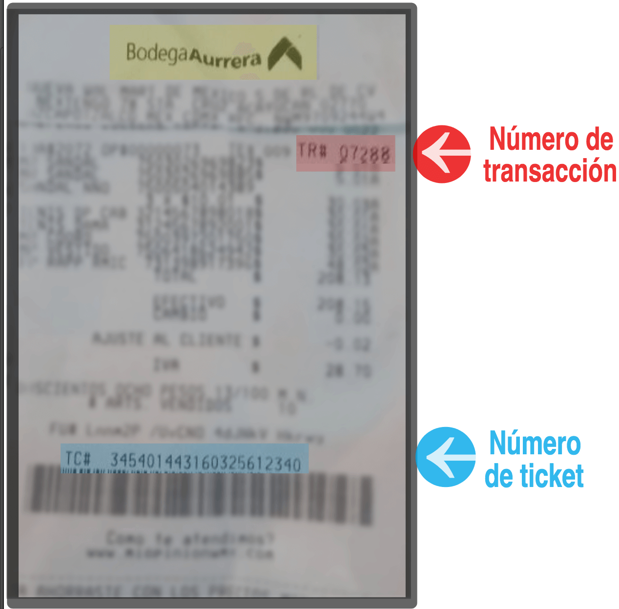 Complete su RFC y Código Postal. Además, del comprobante, extraiga el número de ticket (TC#) de 20 o 21 dígitos y el número de transacción (TR#) de 5 dígitos.